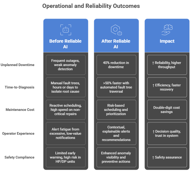 The case of this petrochemical operator underscores how Reliable AI redefines predictive maintenance. By bridging anomaly detection, contextual reasoning, and financial visibility, the framework reduced downtime, optimized maintenance, and strengthened safety.